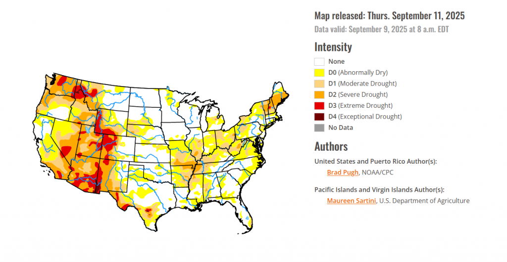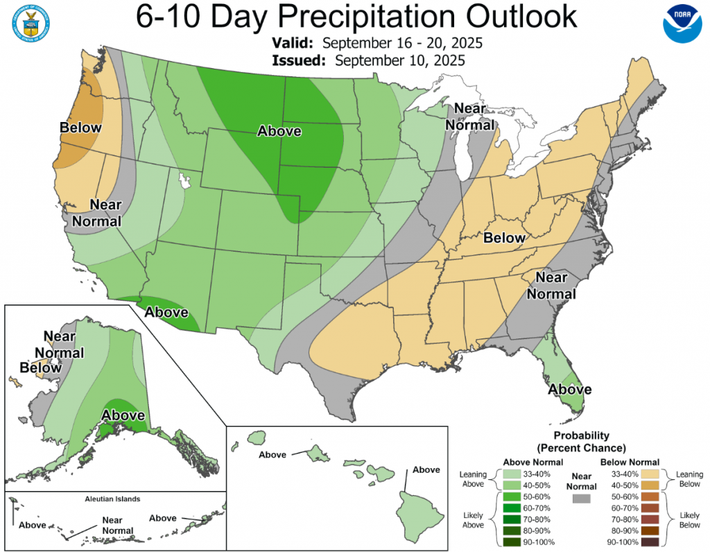 Looking Ahead, The drier pattern is likely to persist across much of the eastern and central U.S. through September 15. Along with the continued dryness dating back to August, a transition to warmer-than-normal temperatures is underway throughout the central U.S. and summerlike heat is forecast to expand east across the Mississippi and Ohio Valleys. From September 13 to 15, maximum temperatures are expected to reach the upper 90s to near 100 degrees F from St Louis south to Memphis. Another week of heavy rainfall is forecast to affect the southern third of the Florida Peninsula and portions of New Mexico. Showers and thundershowers will shift eastward from Oregon and the Northern Intermountain West to the Northern Great Plains. The Climate Prediction Center’s 6-10 day outlook (valid September 16-20, 2025) favors above-normal temperatures for the nearly the entire lower 48 states, southeastern Alaska, and Hawaii. The largest above-normal temperature probabilities (70-80 percent) are forecast across the Mississippi Valley. The outlook leans towards the drier side across most of the Northeast, Mid-Atlantic, Ohio and Tennessee Valleys, and Lower Mississippi Valley. Above-normal precipitation is more likely for the Upper Mississippi Valley, Northern to Central Great Plains, Rockies, and Southwest. The outlook also favors above-normal precipitation for most of Alaska and Hawaii.