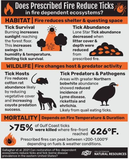 Tick Survival: Burning increases sunlight reaching the forest floor. This increases swings in humidity & temperature, limiting tick survival.