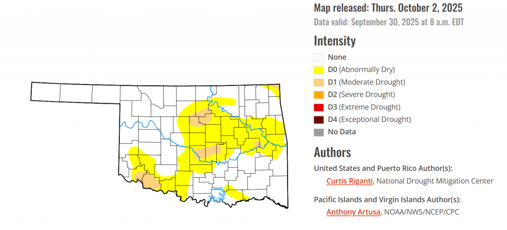 Abnormally dry or worse conditions also continue to spread widely in central and southwestern Oklahoma.