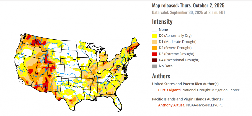 In the southern plains, Like most other regions this week, the South was warmer than normal for late September, with temperature anomalies mostly checking in 2-6 degrees above normal. Rainfall amounts across the region varied widely. Far northern Louisiana and southern and northwest Arkansas were quite wet, with widespread rain amounts from 2-4 inches, with locally higher amounts. Heavier rain amounts of 2-4 inches also fell in parts of southern and western Tennessee. More isolated 1-2 inch rain amounts fell in central Texas and southeast Oklahoma. The central Texas rains were sufficient for a few local improvements, though one area that remained drier saw a local expansion of moderate drought. Farther southeast in Texas, mostly drier weather led to widespread expansion in severe drought in the Austin area, along with expanding moderate drought and abnormal dryness nearby and to the east. Recent drier and warmer weather led to some local expansion of abnormal dryness and short-term moderate drought in central Oklahoma. Moderate drought and abnormal dryness expanded in southern Louisiana and southern Mississippi, with localized severe drought developing along the Mississippi Gulf Coast in response to recent very dry weather and lowering soil moisture amounts. Moderate and severe drought also expanded in east-central Mississippi amid deficits in soil moisture and short-term precipitation.