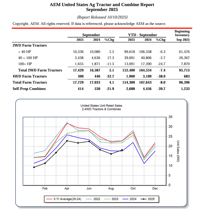 According to recent data from the Association of Equipment Manufacturers (AEM), U.S. sales of agricultural tractors grew 4.1% in September 2025 compared to the year before. U.S. sales of 2-wheel-drive tractors increased 5.1% in the same period.