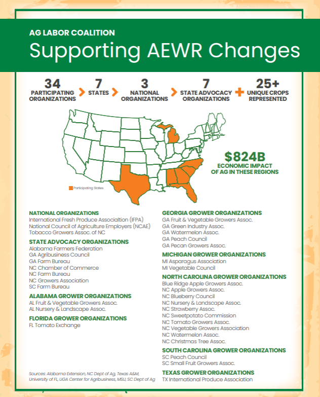 The coalition urges Congress to codify a long-term, market-based AEWR framework that provides certainty for growers while continuing to protect U.S. workers. Doing so would allow producers to plan for inputs, crop rotations, and trade commitments years in advance, not season to season, and would help restore stability to rural communities that form the backbone of the national economy.