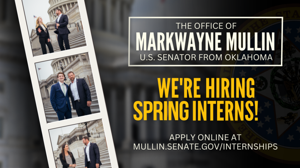 Oklahoma students interested in interning for Senator Mullin can learn more and apply here: https://www.mullin.senate.gov/services/internships/