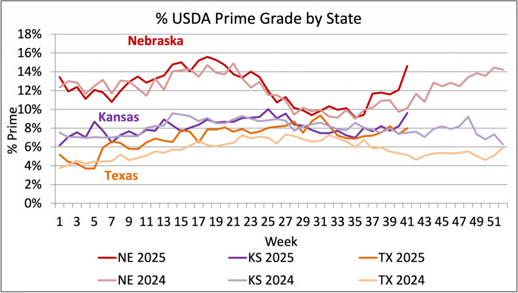 A final optimistic note for cattlemen is the widening of the USDA Prime cutout price spread above USDA Choice; the latest spread is $57/cwt. This bolstered average Prime grid premiums to $22.42/cwt. earlier this month and comes at a time when Prime carcass production is seeing an uptick. Nebraska takes the prize among the largest packing states as feeders in the region are delivering 14.6% Prime carcasses to packers, a big move from the 10% level seen the same week last year. Kansas and Texas grade trends are similarly impressive, with Kansas up to 9.7% and Texas closing the gap at 8% Prime.