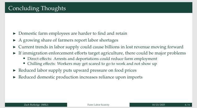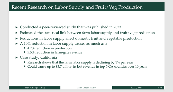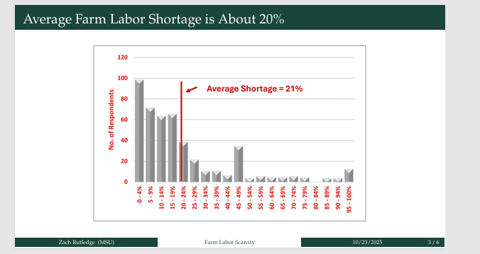 Agricultural economist Dr. Zach Rutledge of Michigan State University highlighted the data proving the severity of the shortage. His surveys indicate that about half of all farmers are experiencing some degree of labor shortage, with the average deficit being approximately 20% of the labor force.