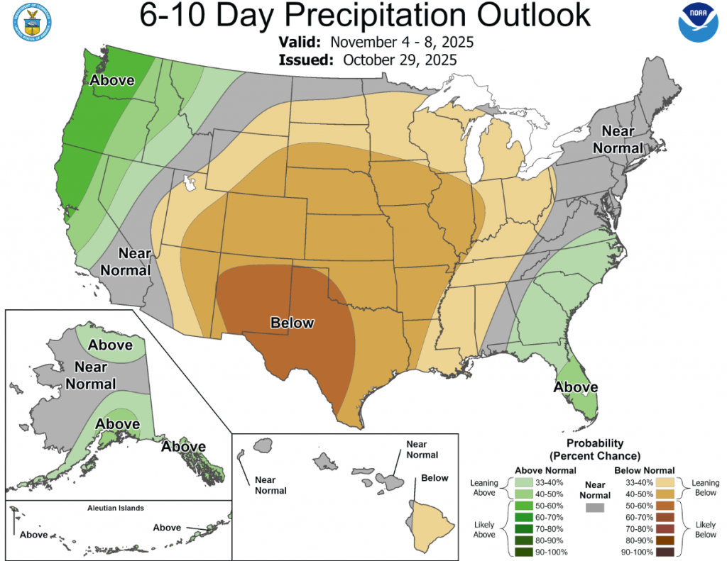 According to the 6-to-10-day precipitation outlook map, a large majority of the state is leaning below 40-50% chance of rain through November 8, with far Southwestern Oklahoma leaning below 50-60% chance through that same date.