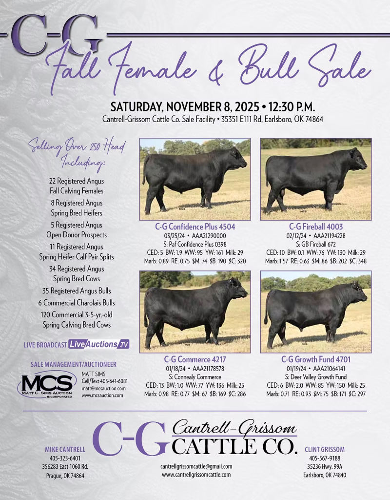 Cantrell- Grissom Cattle Co. bull and female sale will take place this Saturday November 8th at 12:30PM in earlsboro Oklahoma.