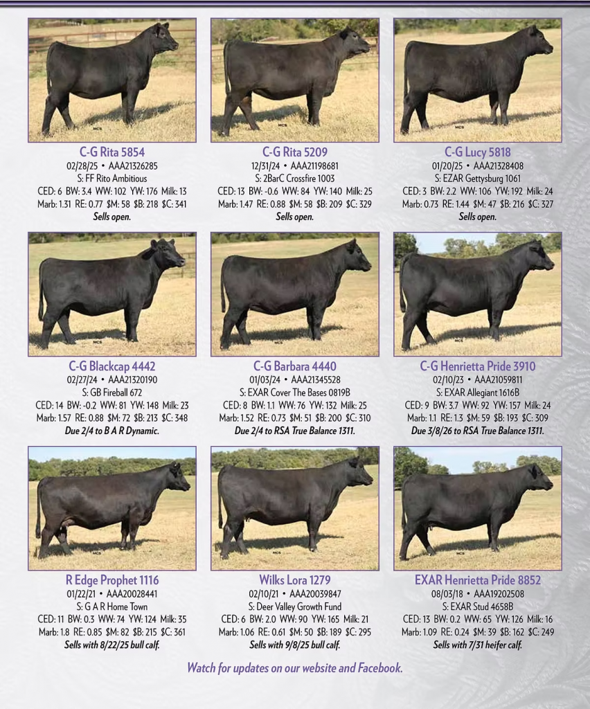 The event will feature over 250 head, including Registered Angus females, donor prospects, bred cows, heifer calf pairs, and 35 Registered Angus bulls alongside commercial Charolais and Angus cows. Highlighted sires include C-G Confidence Plus 4504, C-G Fireball 4003, C-G Commerce 4217, and C-G Growth Fund 4701.