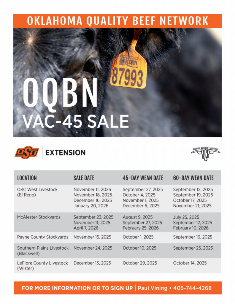The Oklahoma Quality Beef Network (OQBN) is a joint project of the Oklahoma Cooperative Extension Service and the OCA. OQBN is a network of beef producers, educators, veterinarians, and industry professionals committed to increasing producers’ access to value added marketing opportunities and improving the quality of cattle produced in Oklahoma by increasing communication between all segments of the beef industry.
