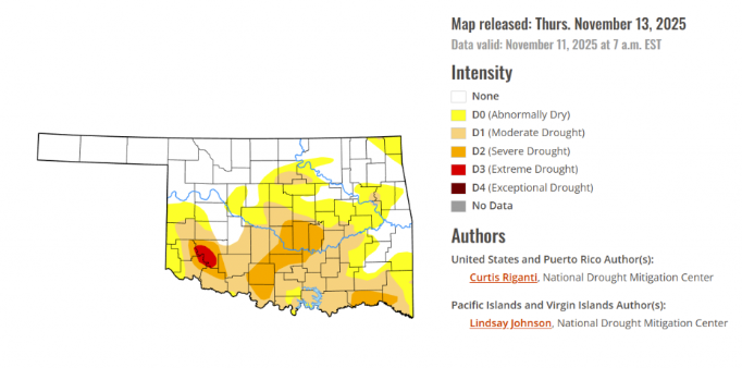 At an emergency drought committee meeting, Oklahoma Conservation Commission Executive Director Trey Lam shared an overview of the state’s worsening drought conditions with Associate Farm Reporter Carli Davenport. He said the panel heard from state climatologist Gary McManus, noting that “drought has been growing across the state, and actually maybe a little more severe even than the Drought Monitor would indicate.” Lam added that McManus has been pushing for updated classifications because “the drought is back on in Oklahoma after a fairly wet summer.” However, Lam said there is optimism, as “the chances of rain are much higher this week.”