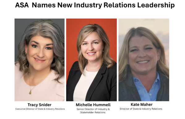 Snider will oversee ASA’s state and industry relations team in overall strategy and partnerships, while Hummel will continue leading key programs and corporate engagement initiatives. Maher will support national engagement efforts with state associations, industry stakeholders, and allied organizations.