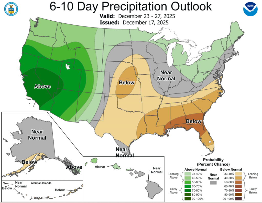 According to the 6-to-10-day precipitation outlook map, a large majority of Oklahoma is leaning below 33-40% chance of rain through December 27, with the far western tip of the panhandle expecting near normal conditions through that same date.