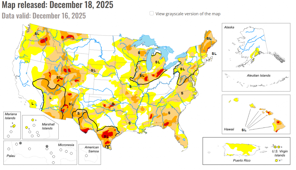 This week, temperature and precipitation patterns varied sharply across the country. Temperatures were generally warmer in the West and colder in the east, with much of the Cascades and Rocky Mountains running well above normal while the Midwest experienced much colder-than-normal conditions. Multiple Pacific storm systems brought widespread precipitation to the Pacific Northwest and northern Rockies, falling as rain at lower elevations and snow in the mountains; however, despite recent snowfall, snowpack remains below normal for mid-December. East of the Rockies, precipitation was more limited and uneven, and where it did occur across the northern Plains and Midwest, it often fell as snow. As a result, drought conditions improved mainly across parts of the Pacific Northwest and northern Rockies. Additional localized improvements occurred in parts of the Southeast, where lingering benefits from rainfall in prior weeks continued to support soil moisture and streamflows. In contrast, areas farther south and east that missed meaningful precipitation saw conditions persist or worsen. Across portions of the southern Plains, lower Mississippi Valley, Ohio Valley, Mid-Atlantic, and Northeast, continued precipitation deficits and declining streamflows led to degradations. In the Midwest, colder temperatures limited precipitation to fall as snow, slowing hydrologic response and resulting in mostly localized changes.