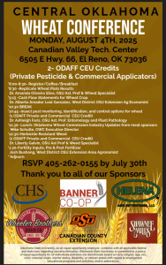 The Canadian County OSU Extension Office is hosting the Central Oklahoma Wheat Conference, Monday, August 4, 2025. There will be 2 ODAFF CEU credits offered for private pesticide, commercial applicators, and research & demonstration. The conference will be held at the Canadian Valley Technology Center Seminar Room, 6505 E. Hwy 66. El Reno, OK. We …