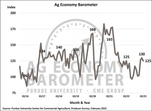 The Purdue University/CME Group Ag Economy Barometer dipped 5 points to a reading of 125 in February. Farmers’ perspectives regarding both current conditions on their farms and their expectations for the future also weakened. The Index of Current Conditions fell 2 points to 134 and the Index of Future Expectations declined 6 points to 121. …