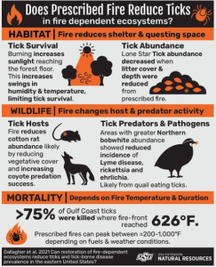 HABITAT | Fire reduces shelter & questing space Tick Survival: Burning increases sunlight reaching the forest floor. This increases swings in humidity & temperature, limiting tick survival. Tick Abundance: Lone Star Tick abundance decreased when litter cover & depth were reduced from prescribed fire. WILDLIFE | Fire changes host & predator activity Tick Hosts: Fire …