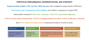 TOTAL FUNDS INVESTED Funds available for investment at market value include the State Treasurer’s investments at $12,267,490,678 and State Agency balances in OK Invest at $3,512,931,865, American Rescue Plan investments at $960,230,222, and the Oklahoma Capitol Improvement Authority Legacy Fund at $863,965,960 for a total of $17,604,618,725. he year-to-date returns for the major stock indices were higher for August compared to July with …
