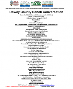 Coleta Bratten, Chair, High Plains Resource Conservation & Development Council (HPRCD) has announced that HPRCD, Dewey County Conservation District, the Bank of Western Oklahoma, USDA-NRCS, and the Oklahoma Conservation Commission will host a Ranch Conversation in Taloga, Oklahoma on March 20, 2025. Bratten said “we are honored that our Congressman Frank Lucas will take time …