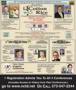 The 28th Annual National Conservation Systems Cotton & Rice Conference, The Southern Soybean & Corn Conference, the Delta States Irrigation Conference and the Southern Precision Ag Conference are headed to East Memphis Hilton Conference Center. The conferences are sponsored by Cotton Incorporated and U.S. Rice Producers Association. Producers mark your calendar for January 27th & …