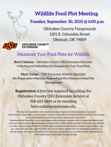 Wildlife Food Plot Meeting Join us Tuesday, September 30, 2025, at 6:00 p.m. at the Okfuskee County Fairgrounds (1201 E Columbia Street, Okemah, OK 74859). Come learn tips and techniques to maximize your food plots from OSU Extension specialists covering: Soil sampling & preparation Planting times & mixtures Food plot management strategies Registration is FREE but required Call the …