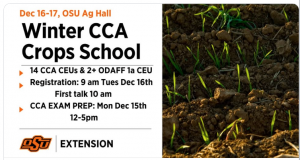 Registration is Live for the OSU 2025 Winter CCA Crops School. Still finalizing the agenda, but shaping up to be another great series. Sign up now, space is limited. Space is limited to the first 160 Registration includes: Breaks, 2 lunches Registration begins at 9:00 am on Tuesday, December 16, 2025. CCA Exam Prep Course …