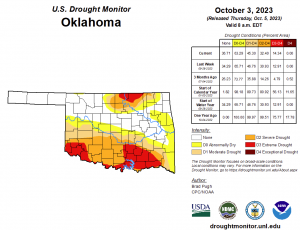 To view the latest Oklahoma drought map, CLICK HERE. According to the latest Oklahoma Drought Monitor, Exceptional Drought remains at Zero percent, unchanged for the past few weeks. Extreme drought or worse is now at 14.34, up from last weeks, 12.91 percent. Severe drought or worse is now at 32.40 percent, up from last week’s 30.93 percent. Moderate …