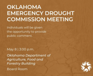 The Oklahoma Emergency Drought Commission will meet on May 8 at 10:00 Am at the Oklahoma Department of Agriculture Building in the board room. There will be an opportunity for public comment. Oklahoma’s Emergency Drought Commission, enabled through passage of Enrolled House Bill 1923 in 2013, provides funding for drought mitigation and related projects in Oklahoma in …