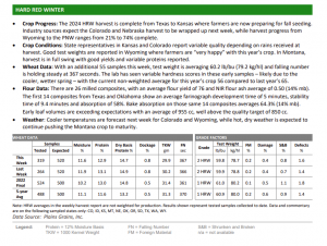 WEEKLY HARVEST REPORT – August 4, 2023 The HRW harvest is gaining momentum in the north and northwest; protein decreased to 11.6% (12% mb). SRW composite testing continues with final flour, dough and bake results to come; the final grade average for the 2023 crop is U.S. No. 1 SRW. The SW harvest continues apace …