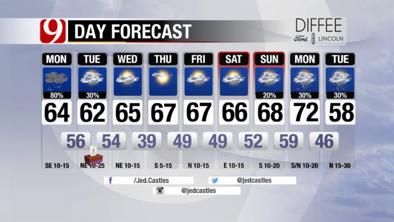|  Fall Like Weather Ahead for Oklahoma- and a couple of light doses of Moisture    Jed Castle with News9 offers us a nine day forecast graphic this morning- including chances of rain today and then again in about a week-   Alan Crone with the News on 6 writes in his Monday morning blog "spotty showers will be possible today as a weakening upper level low  ejects into the central U.S. over the next 24 hours.   A cold front will  move across the area Tuesday morning bringing an end to the  precipitation chances with generally pleasant weather following for the  remainder of the week."Click here  and you can read his full analysis of the weather ahead for Green Country.   |